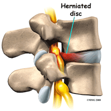 Disc Herniations![]() The spinal disc is a soft cushion that sits between each vertabrae of the spine. The spinal discs are composed of a tough spongiform ring of cartilage (annulus fibrosus) with a more malleable center (nucleus pulposis). Like a shock absorber for a car, the disc is the shock absorber for the spine. When too much pressure is placed on the disc, it bulges or herniates. Think of it like a jelly doughnut’Ķ squeeze it too hard and the jelly comes out. That is called a Herniated Disc (Slipped Disc, Bulging Disc). How Does a Herniated Disc Occur?The discs cushion the spine from compressive forces, but are weak to pressure applied during rotational movements. That is why a person who bends to one side, at a bad angle to pick something up, may more likely herniate a spinal disc than a person jumping from a ladder and landing on his or her feet. Herniation of a disc occurs when the liquid center of the disc bulges outwards, tearing the external ring of fibers, extrudes into the spinal canal, and compresses a nerve root. This extruded liquid from the nucleus pulposus may cause inflammation and swelling of surrounding tissue which may cause further compression of the nerve root in the confined space in the spinal canal. What causes symptoms of a herniated disc?When the herniated disc ruptures and pushes out, the nerves may become pinched. When a herniated disc occurs, the space for the nerves is further diminished, and irritation of the nerve results. This irritation of the nerves going down the arms or legs can lead to the characteristic signs of a disc herniation including but not limited to shooting, electrical pain down the arms and legs and numbness and tingling in the hands and feet. What are the symptoms of a herniated disc?When the spinal cord or spinal nerves become compressed, they don't work properly. This means that abnormal signals may get passed from the compressed nerves, or signals may not get passed at all. Common symptoms of a herniated disc include: